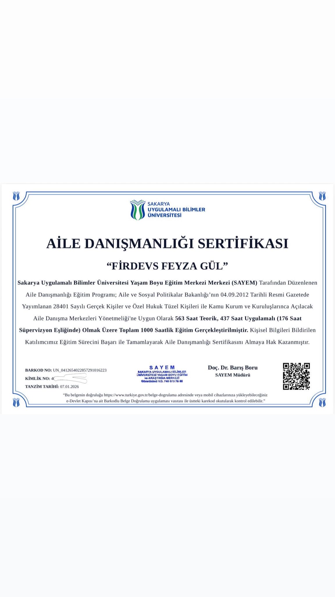 Aile Danışmanlığı eğitimimi tamamlayarak, aile sistemlerini daha bütüncül bir bakış açısıyla ele alma ve değerlendirme konusunda derin bilgi edindim.